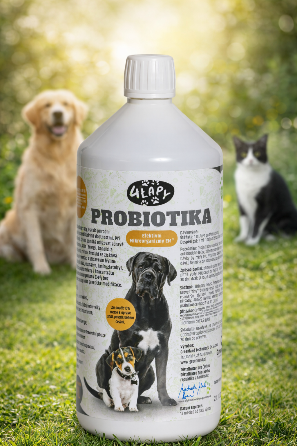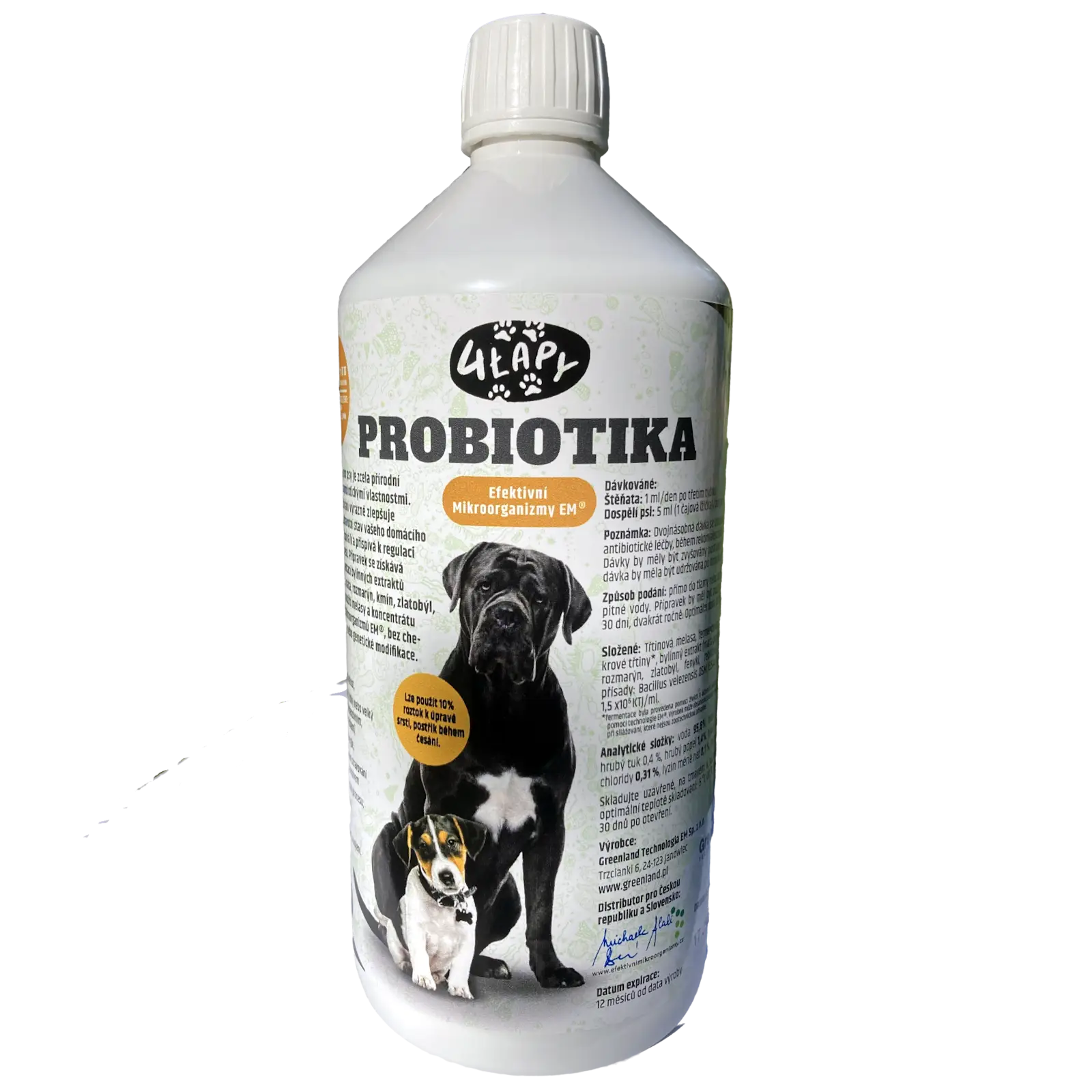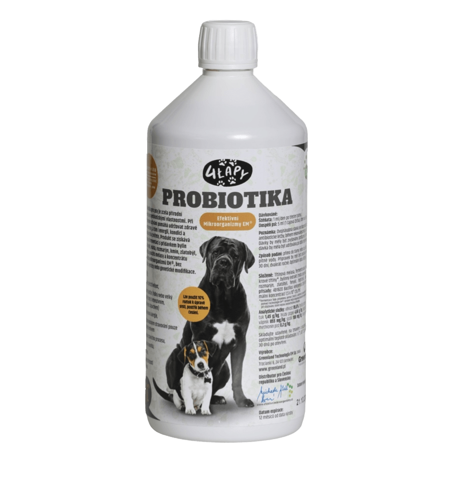 4 Lapy Probiotika pro psy je přírodní přípravek se symbiotickými vlastnostmi. Pravidelné používání výrazně zlepšuje a vyrovnává zdraví vašeho mazlíčka a pomáhá regulovat trávicí procesy. Produkt se získává přírodní fermentací bylinných extraktů (anýz, fenykl, máta, rozmarýn, kmín, zlatobýl, řebříček) za použití melasy a koncentrátu EM® bez chemické syntézy a genetické modifikace.