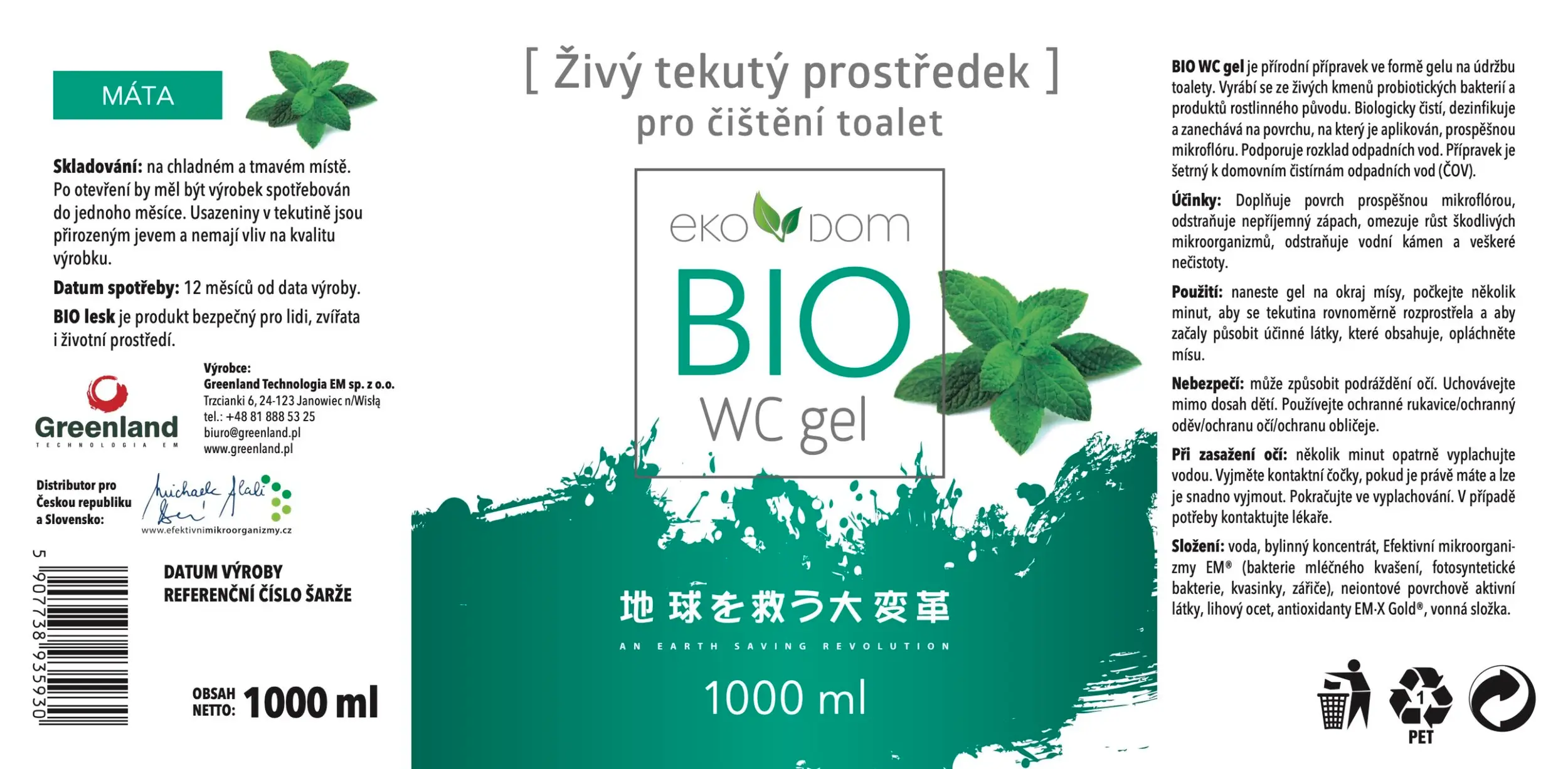 Zcela přírodní gelový čistící prostředek s vůní máty pro udržování čistoty na toaletě. Velmi účinně čistí, dezinfikuje a odstraňuje vodní kámen, skvrny a nepříjemný zápach. Díky přídavku EM® osidluje čištěné povrchy přátelskou mikroflórou a omezuje růst zdraví škodlivých mikroorganizmů.