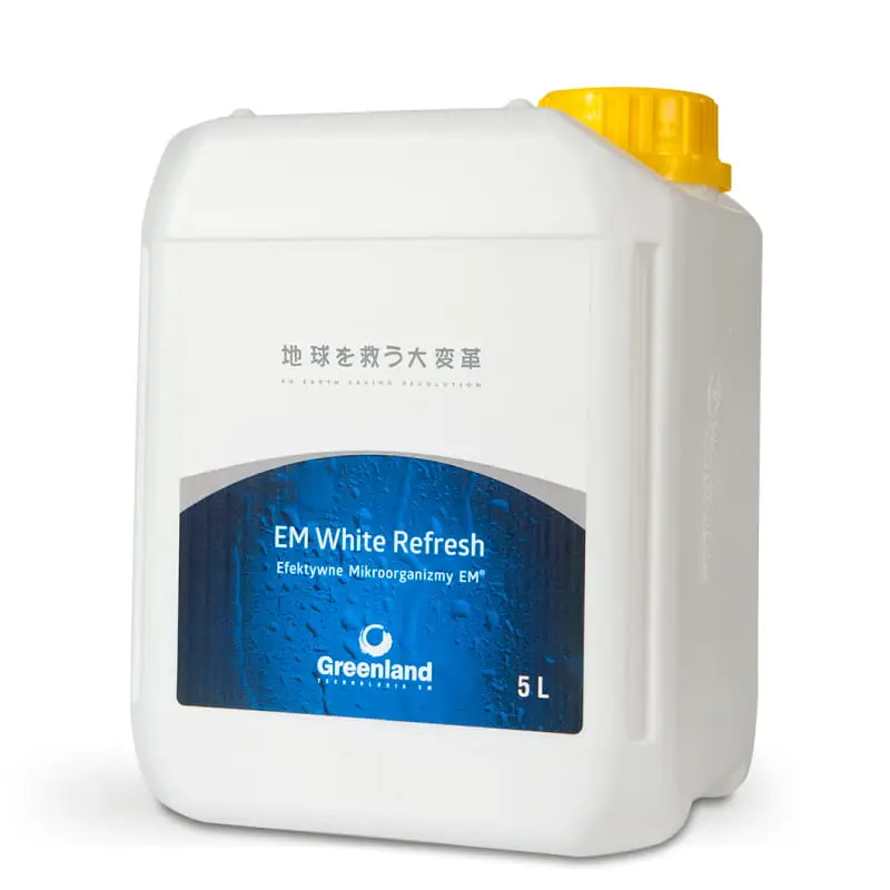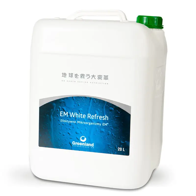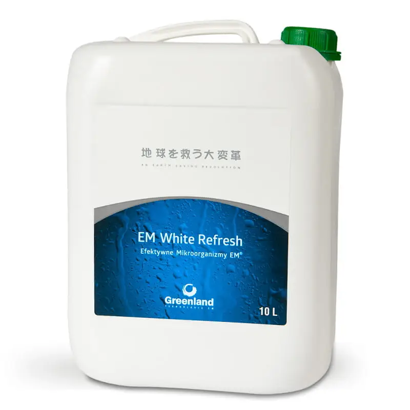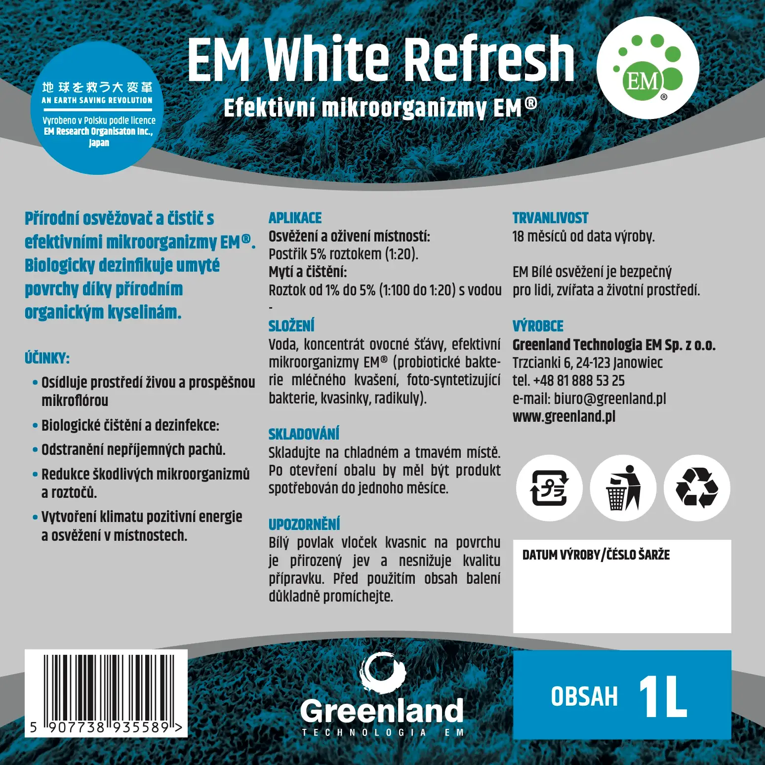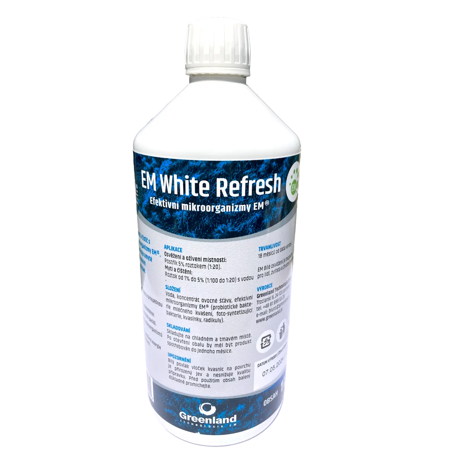 EM White Refresh (Bílé osvěžení) je přírodní univerzální přípravek. Lze jej použít jako osvěžovač a čistič na všechny druhy povrchů, k zamlžování místností v domácnosti i v kanceláři a také k čištění rybníků. Obsahuje přírodní organické kyseliny a enzymy získané fermentací EM® s bylinami, ovocem a rýžovými otrubami. Přípravek osídluje prostředí prospěšnou mikroflórou, biologicky čistí a dezinfikuje povrchy, odstraňuje nepříjemné pachy, omezuje růst škodlivé mikroflóry a roztočů.
