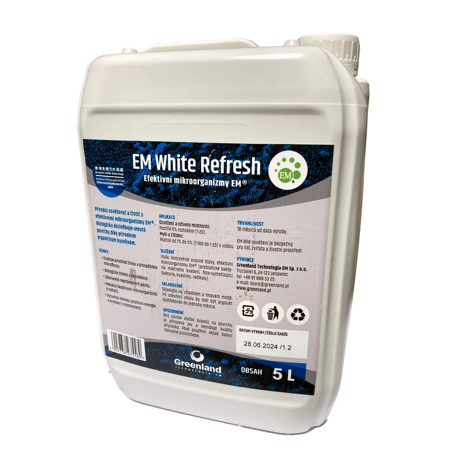 EM White Refresh (Bílé osvěžení) je přírodní univerzální přípravek. Lze jej použít jako osvěžovač, čistící prostředek na všechny druhy povrchů, k zamlžování místností v domácnosti i v kanceláři a také k čištění rybníků. Obsahuje přírodní organické kyseliny a enzymy získané fermentací EM® s bylinami, ovocem a rýžovými otrubami. Přípravek osídluje prostředí prospěšnou mikroflórou, biologicky čistí povrchy, odstraňuje nepříjemné pachy, omezuje růst škodlivé mikroflóry a roztočů.
