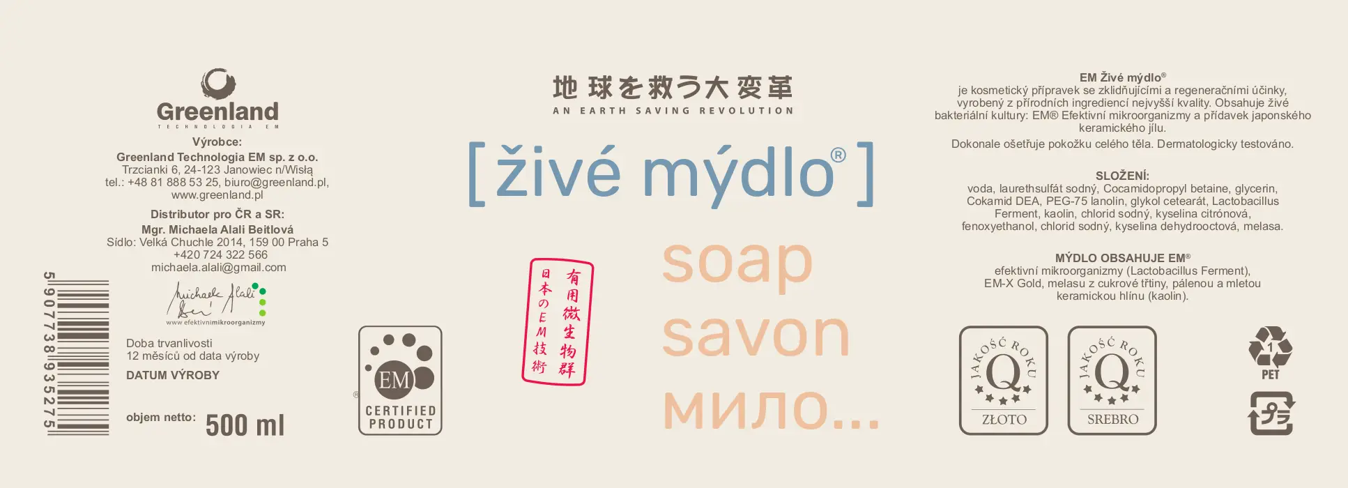 EM®, antioxidanty EM-X Gold® a přídavek japonského keramického jílu. Dokonale ošetřuje pokožku celého těla a může úspěšně nahradit šampon s kondicionérem. Díky obsahu bakterií mléčného kvašení jej lze použít i pro intimní hygienu.