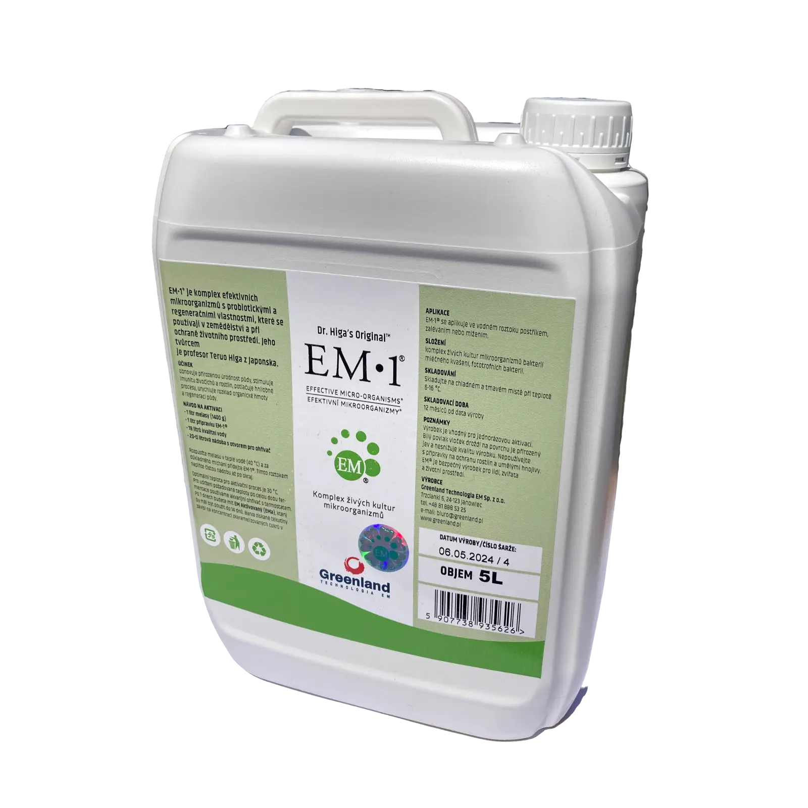 EM1® je koncentrát Efektivních mikroorganizmů, které by měly být aktivovány v procesu fermentace s médiem (EM melasou z cukrové třtiny) a teplou vodou o teplotě 35-37 ℃. Výsledný přípravek lze použít k péči o rostliny, kompostování organických zbytků, ošetření půdy.